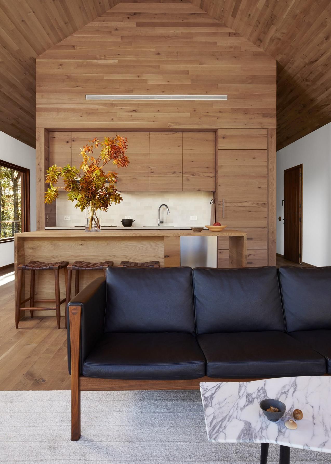 In the kitchen, the wall, ceiling, cabinets and refrigerator, all cloaked in white oak, came courtesy of the architect. “We contemplated a very beautiful sort of refined-industrial island, but it was rejected,” said Ms. Keck. “It was quite open and the client didn’t want to have kitchen things visible from the great room.” Instead, the designer had an enclosed island built, its wood veneer matching the existing paneling and cabinets. Backless bar stools by local furniture maker Michael Robbins joined the scene unobtrusively, and tiny fixtures hang from the ceiling. “We have a substantial lamp from Allied Maker above the dining table,” said Ms. Keck, “and one strong lighting piece in a space like this is plenty.”