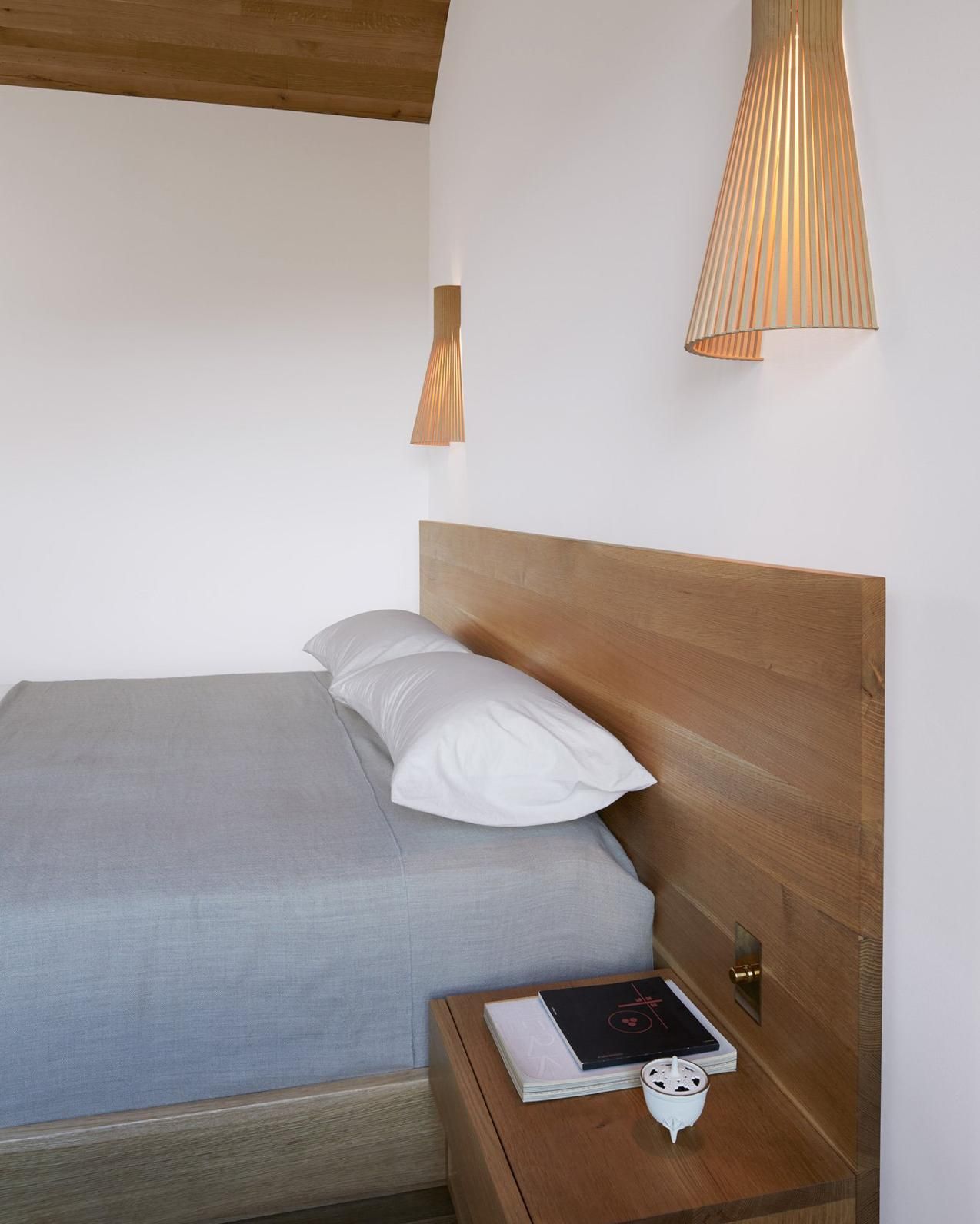 In the master bedroom, a white oak headboard with integrated night stands, by Oregon’s Chadhaus, continues the home’s celebration of natural materials. “We asked the maker to select boards that had the light streaks of sap, which really highlights the beauty of this common material,” said Ms. Keck. Finnish brand Secto’s fixtures emit light through strips of wood. “That reminds me of the screen downstairs, in an intuitive remote way..”