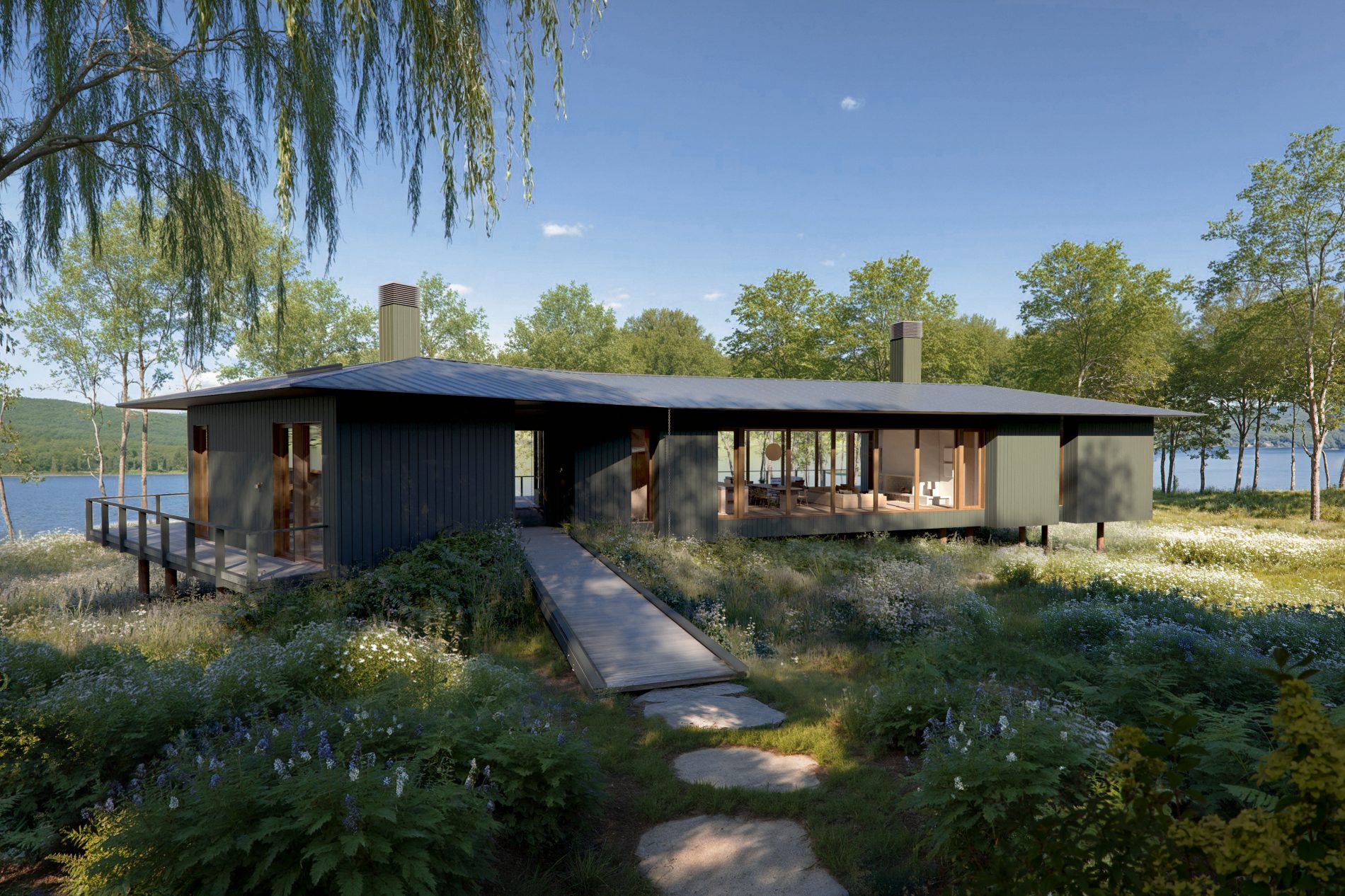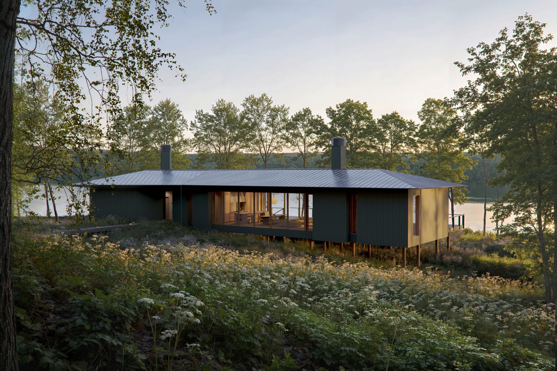 Twin Chimneys House is a single story house built on piers on the shores of Kenoza Lake in the Hudson Valley.