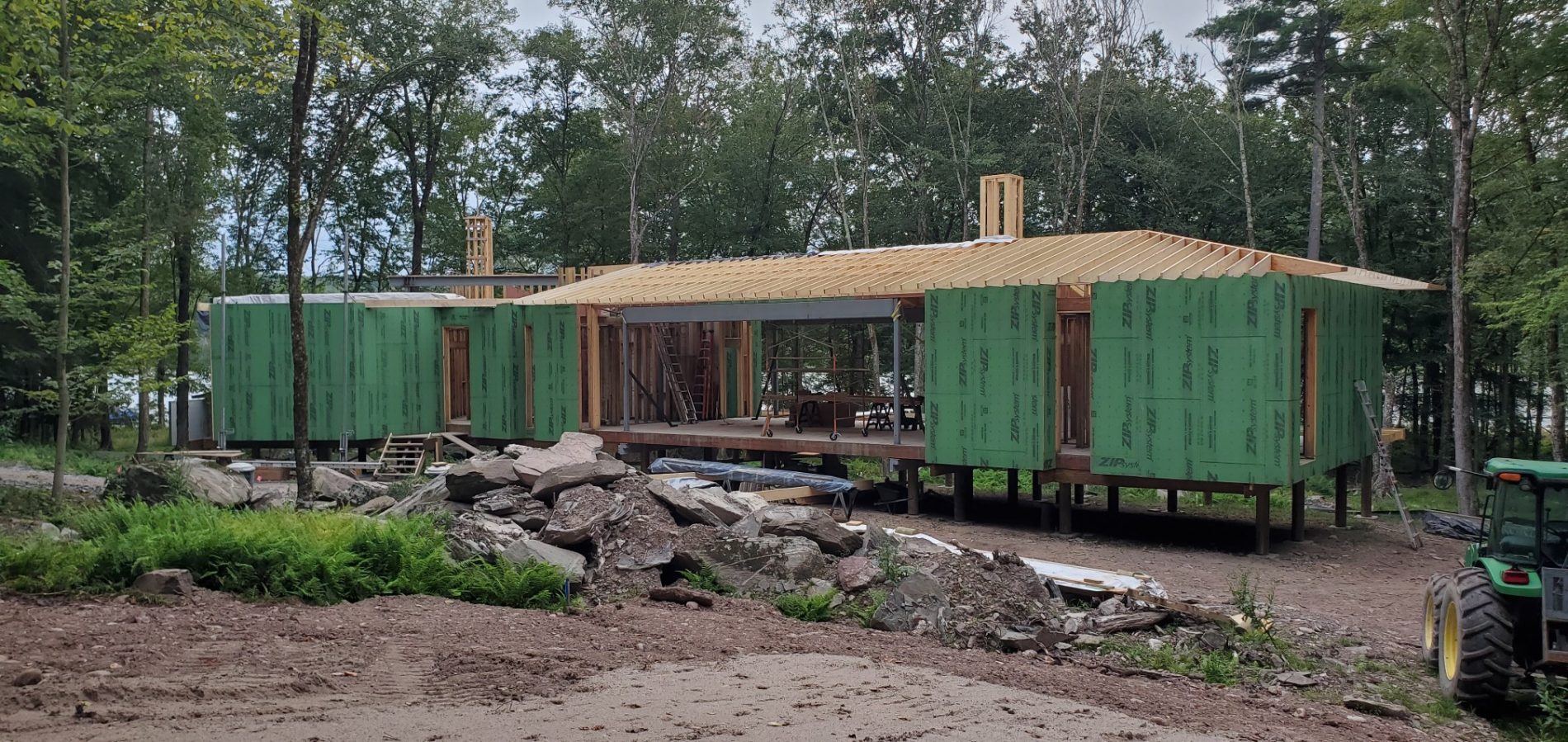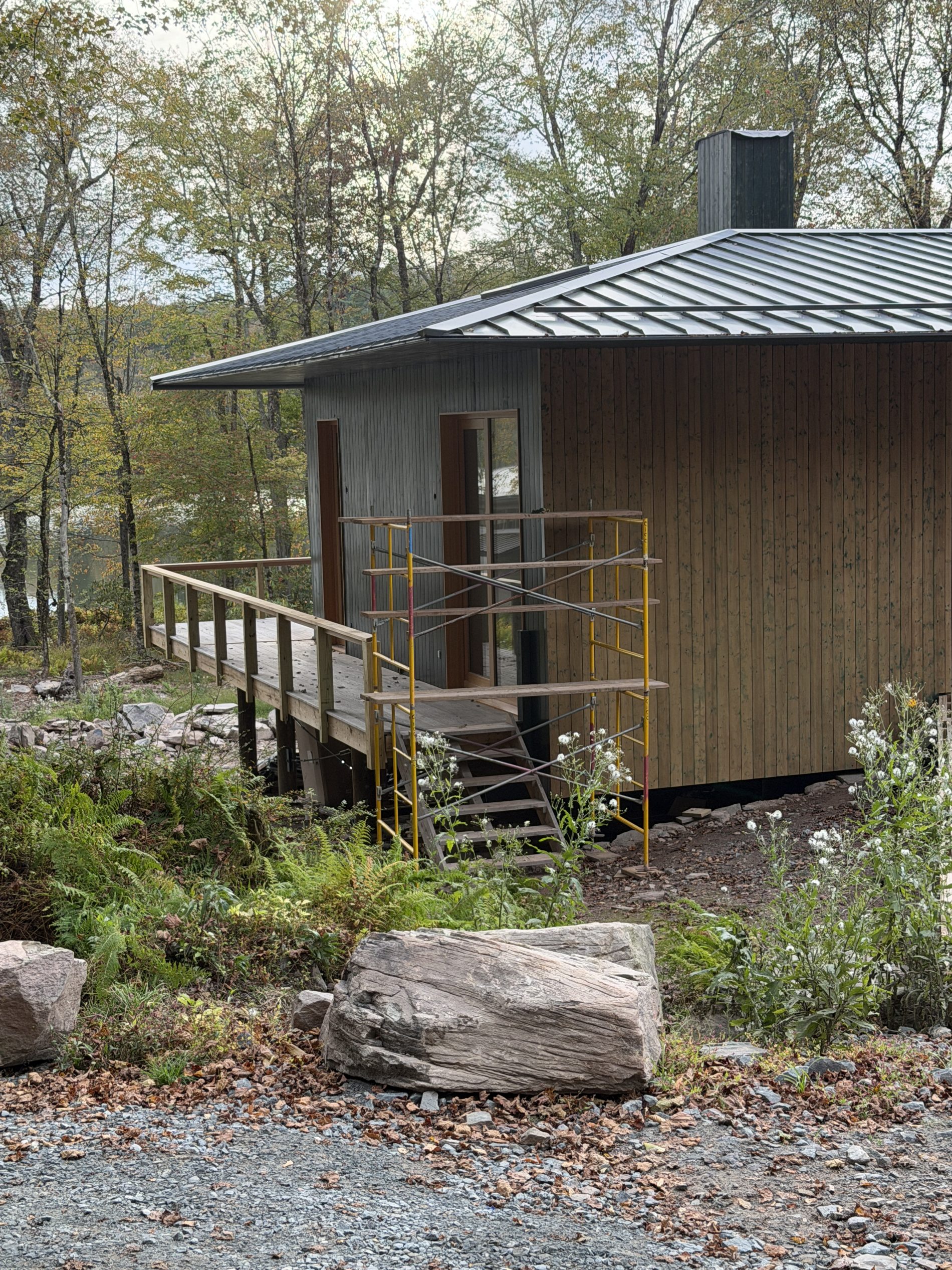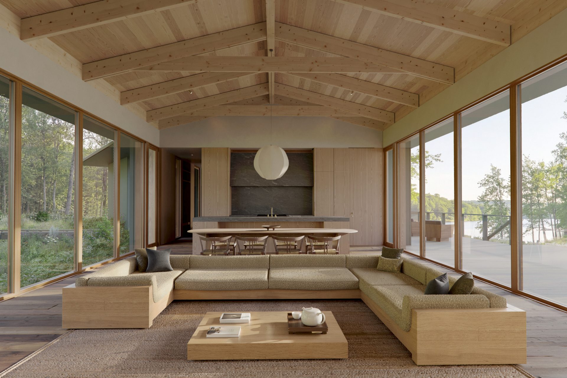 The Twin Chimneys House is a single story, three bedroom wood clad house in a mature woodland with sweeping lake views. Approaching the house from the road, visitors meander downhill through 14 forested acres, with views through the trees to the lake.